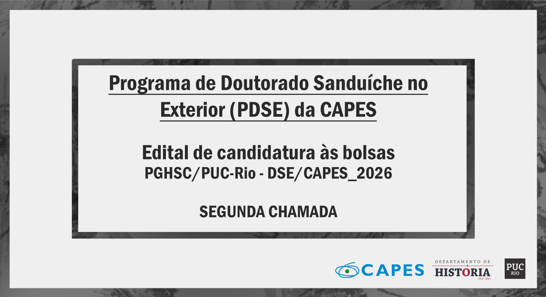 O Programa de Pós-Graduação em História Social da Cultura da PUC-Rio divulga a Seleção de candidatos (as) estrangeiros (as) a bolsas de Doutorado Sanduíche do Programa PEC-PG da CAPES!